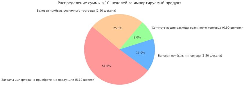 В исследовании подробно показано, как распределяется сумма в 10 шекелей, уплаченная конечным потребителем за импортируемый продукт: 5,10 шекеля покрывают затраты импортера на приобретение продукции у производителя, 1,50 шекеля составляли валовую прибыль импортера, 90 агор покрыли сопутствующие расходы розничного торговца, а оставшиеся 2,50 шекеля составили валовую прибыль розничного торговца.
