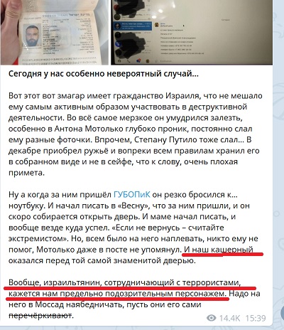 «Израильтянин, сотрудничающий с террористами, кажется нам предельно подозрительным персонажем», — напрямую сказано в сообщении. Причем к «сотрудничеству с террористами» силовики приравняли… переписку Плащинского с редакторами оппозиционных телеграм-каналов.