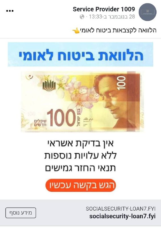 Служба национального страхования («Битуах леуми») предупреждает о мошенниках, предлагающих в социальных сетях ссуды якобы от имени ведомства.
