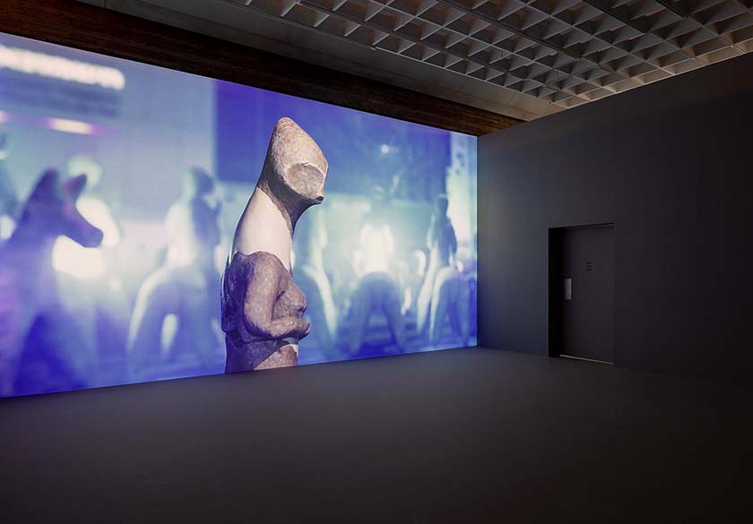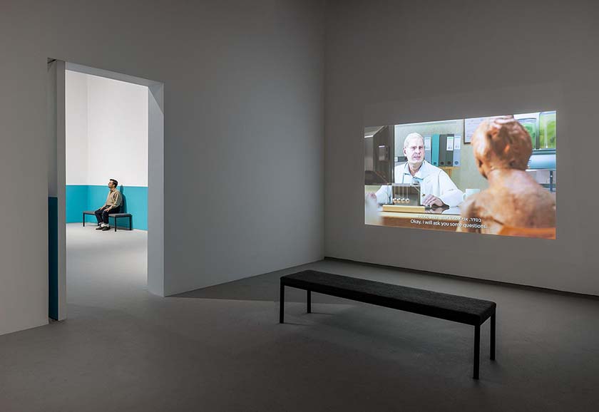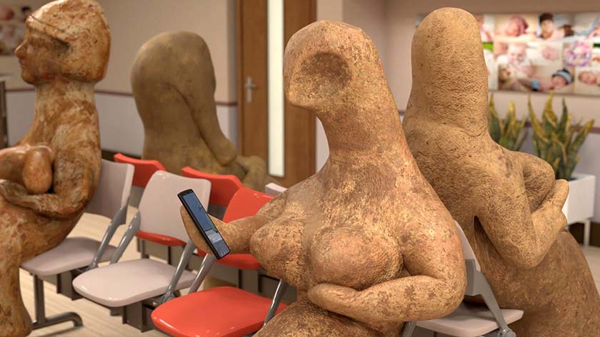 Второй зал сделан как место для ожидания в клинике репродуктивной медицины: банкетки по периметру, экраны на стенах. На этих экранах мы видим ту же рекламу, что обычно бывает в больницах, плакаты с младенцами и муляжами женских органов размножения, слышим голоса, указывающие кому в какой кабинет идти, а ещё видим женщин, сидящих в ожидании приёма. Все они выглядят как разнообразные древние фигурки плодородия, очень условные, где самое главное — грудь. Но делают они то же самое, что сегодняшние женщины: сидят в телефоне. И мы видим у кого-то, листающего Тиндер, что мужчины в этом мире — это древние глиняные фигурки конных всадников. Как говорит потом автор: никто не знает, кто эти наездники, важно, что на лошади. И ещё одна деталь, которая должна была бы сильно сработать в Венеции: в музейном зале мы видим экраны на стенах больницы, и на них идут реальные израильские новости этого момента, инкорпорированные в арт-видео. И то, что драматическая личная история сразу оказывается включена в мрачную политическую повестку страны, даёт всему проекту другой объем.