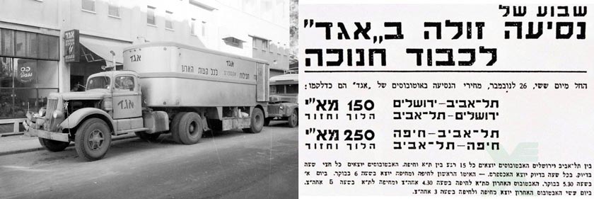 30-е годы: «Эгед Хавилот» – служба доставки, созданная вскоре после основания кооператива «Эгед». Первая независимая посыльная служба, которая обслуживала еврейское население еще в подмандатной Палестине. С водителями Эгед передавали бандероли, посылки, письма, а грузовики доставляли их. Путь посылки из Иерусалима в Тель-Авив занимал около двух часов. Взгляните также на очень старое объявление о снижении цен в честь Хануки. «Эгед» уже был, а израильского шекеля еще не существовало, и даже израильские лиры еще не были в ходу.