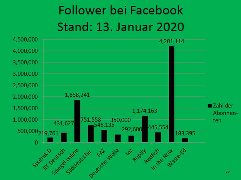 При этом аудитория RT Deutsch растет и уже превзошла даже Deutsche Welle. Новый цифровой канал In the Now также развивается очень успешно: в январе 2020 года только в «Фейсбуке» у него было 4.2 млн. подписчиков. С коронавирусом эти СМИ в значительной степени активизировались, делая акцент на том, что правительство Германии прибегает к репрессивным мерам, угрожающим свободам ее граждан. Их цель — ослабить популярность противников России, ЕС и федерального правительства Германии, и усилить российское влияние в Европе.