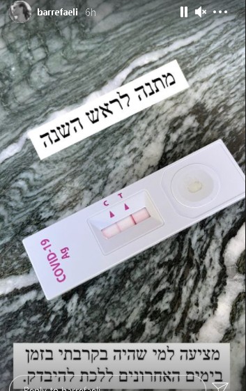 Через несколько месяцев после того, как ее мама, Ципи Рафаэли, переболела COVID-19 и выздоровела в женской тюрьме «Неве-Тирца», супермодель Бар Рафаэли внезапно узнала, что также инфицирована «короной». Бар Рафаэли сделала домашний тест и получила положительный результат.