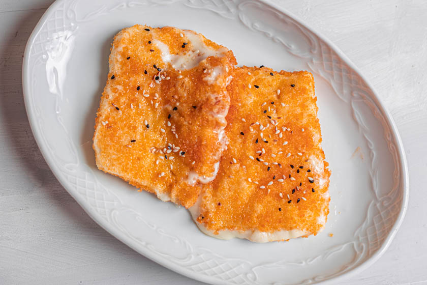 Хачими – панированный сыр обжаривается до хрустящей золотистой корочки, а сверху посыпается ароматным кунжутом, который добавляет легкую ореховую нотку. Идеальная закуска к бокалу грузинского вина.