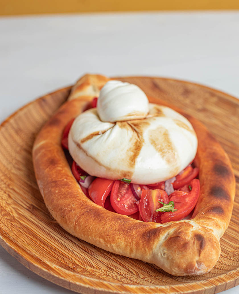 Буратта Аджарули – неожиданное сочетание классики и новаторства. Нежная, тающая во рту буррата, сливочной консистенции подается с томатами в лодочке из хрустящего теста. Гармонию вкусов дополняет гранатовый соус наршараб, придающий легкую кислинку, свежий песто с базиликом и оливковое масло.