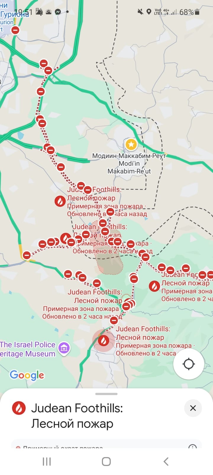 В приложении Google Maps 30 апреля активизировалась очень полезная функция. Приложение отображает в реальном времени активные очаги пожара в Израиле, а также блокировку дорог.
