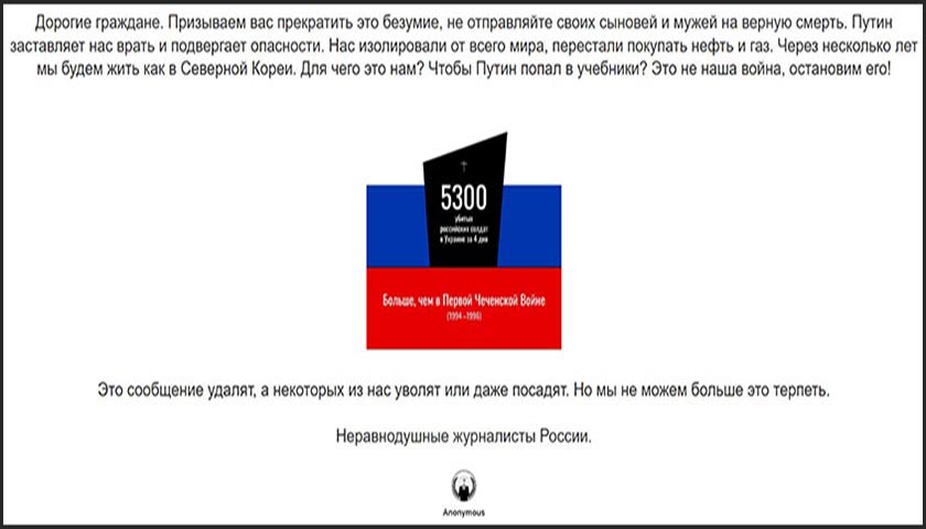 При заходе на сайт tass.ru пользователи увидели баннер с обращением следующего содержания: «Дорогие граждане. Призываем вас прекратить это безумие, не отправляйте своих сыновей и мужей на верную смерть. Путин заставляет нас врать и подвергает опасности. Нас изолировали от всего мира, перестали покупать нефть и газ. Через несколько лет мы будем жить как в Северной Кореи. Для чего это нам? Чтобы Путин попал в учебники? Это не наша война, остановим его!».