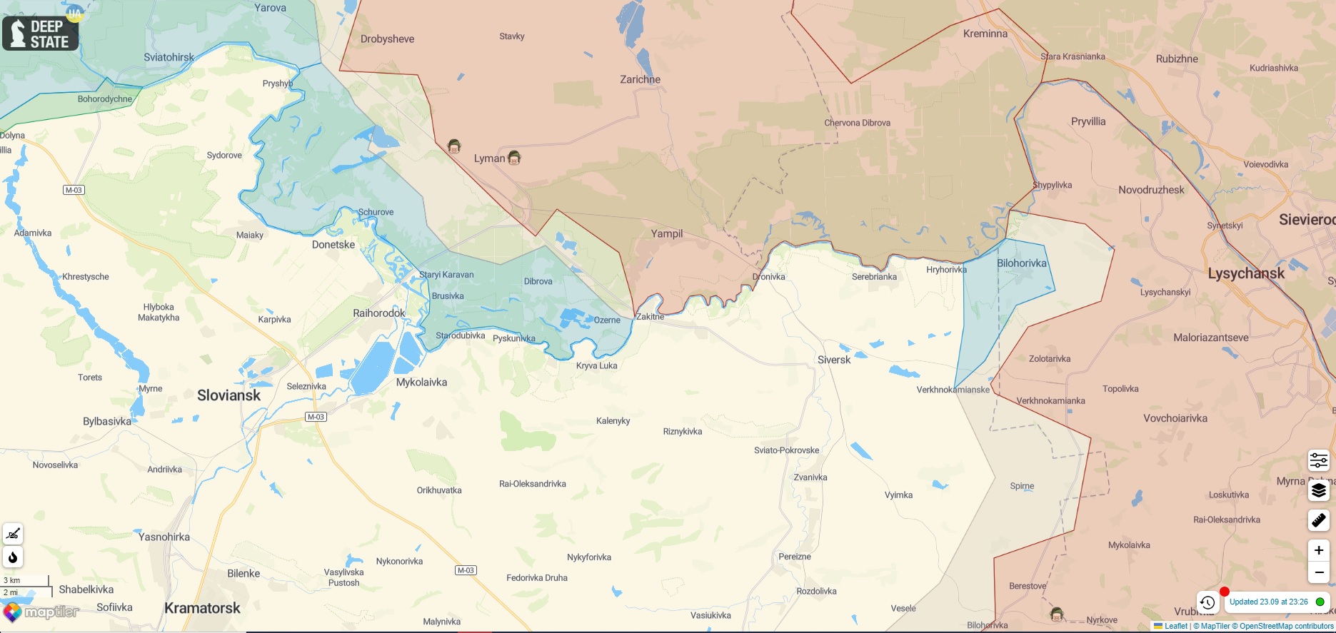 Украинская армия пыталась штурмовать укрепленный район россиян в Лимане, но пока не достигла успеха. Однако, судя по неофициальным сообщениям, украинцы обошли Лиман и прорвали линию российской обороны между Лиманом и Купянском. ВСУ перешли наступление с плацдарма в Святогорске, заняли деревню Яцковка и, по некоторым сообщениям, продвинулись на 20 километров на восток. «Это не единственный успех, про который мы знаем, но придерживаемся режима информационной тишины», — пишут об освобождении Яцковки обозреватели украинского военного проекта Deep State.