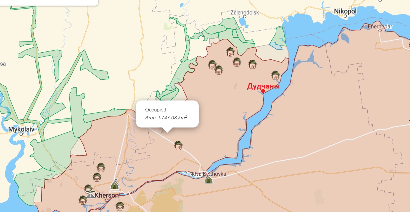 Российские источниики сообщают, что в Херсонской области войска РФ откатились на рубеж села Дудчаны (находится на северном берегу Днепра, северо-восточнее Каховки). На карте украинского проекта DeepState этот участок все еще закрашен розовым как подконтрольная РФ территория.