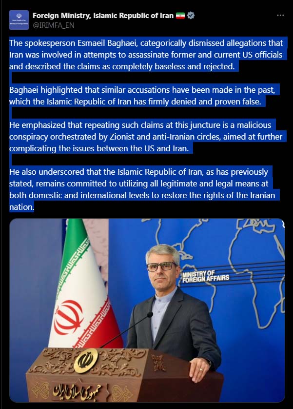 Пресс-секретарь министерства иностранных дел Ирана Эсмаил Багаи решительно отверг утверждения о том, что Иран причастен к попыткам убийства «бывших и действующих американских чиновников», назвав эти заявления «необоснованными».