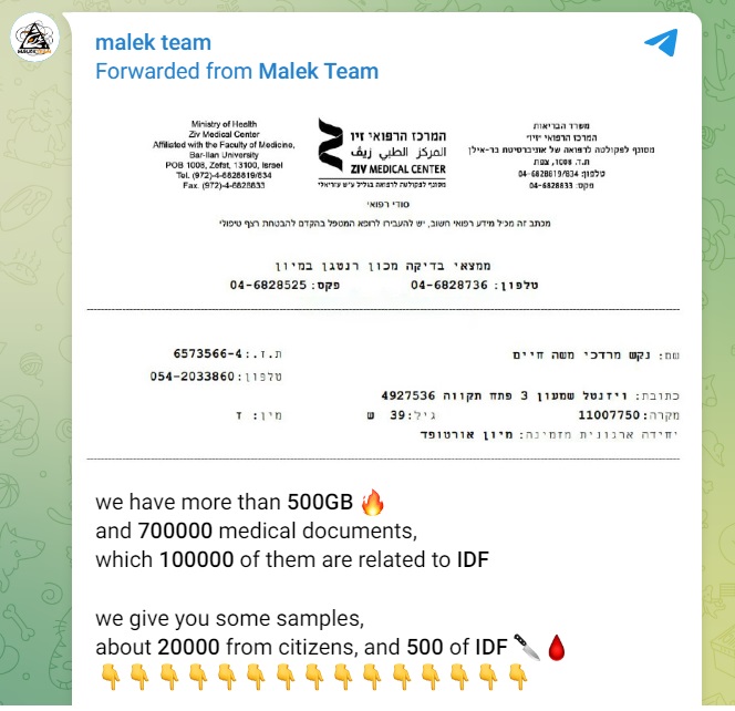 Группа хакеров Malek Team заявила о краже тысяч медицинских записей из медицинского центра «Зив» в Цфате. Атака на больницу привела к несанкционированному доступу к 500 ГБ данных, датированных прошлым годом. Эти данные включают в себя порядка 700 тысяч документов, содержащих личную и медицинскую информацию пациентов, такую как виды заболеваний и назначенные лекарства. По словам хакеров, среди украденных данных находятся записи израильских военнослужащих.