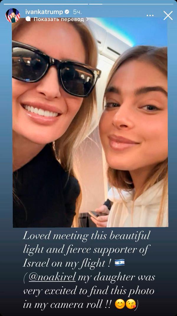 Визит в Израиль Иванки Трамп и ее мужа Джареда Кушнера завершился совсем недавно, и, оглядываясь назад, дочь бывшего президента США продолжает делиться у себя в соцсетях впечатлениями от поездки. В частности, она опубликовала селфи с певицей Ноа Кирель, подписав его: «Моя дочь была очень рада обнаружить это фото в моей галерее».