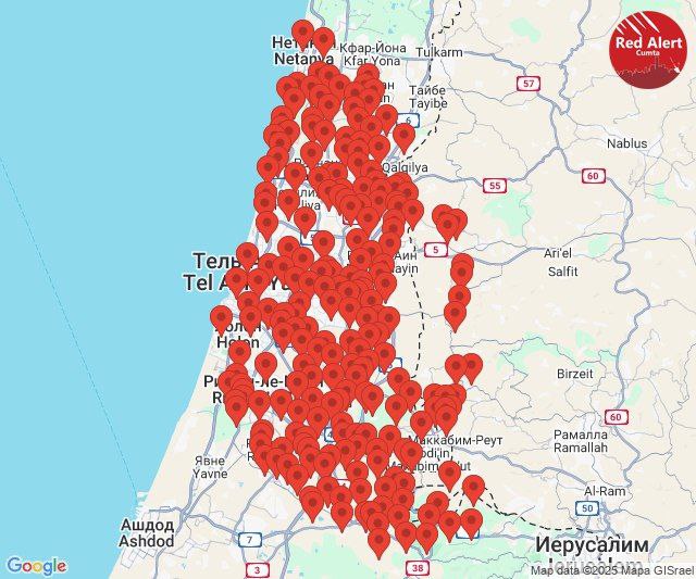 Затем в центре Израиля прозвучали сирены воздушной тревоги. Сирены сработали во множестве городов: Иерусалим, Тель-Авив, Петах-Тиква, Герцлия, Нетания, Кфар-Саба, Раанана, Лод, Холон, Рамат-Ган, Ришон ле-Цион, Модиин-Маккабим-Реут, Реховот, Бат-Ям, Бейт-Шемеш, Гиватаим, и многие другие.