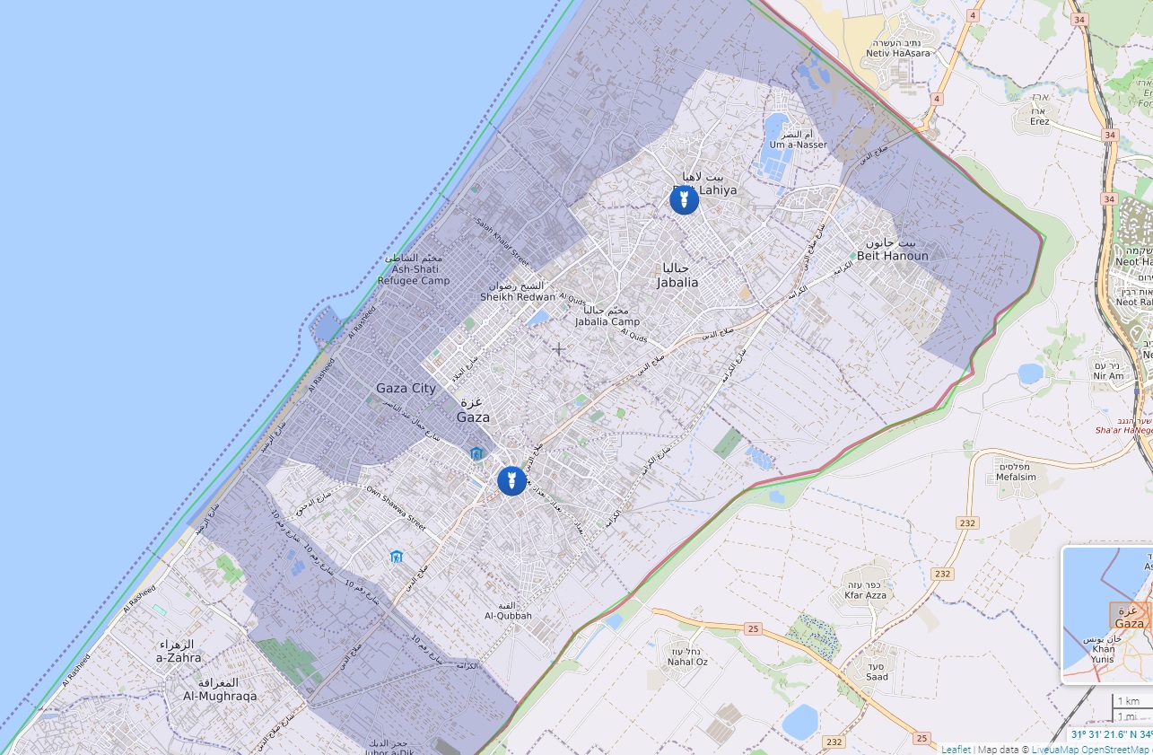 Зарубежный OSINT-проект liveuamap, составляющий карты боевых действий на основе сообщений из открытых источников, приводит следующую карту боевых действий в секторе Газа (серым отмечены районы, которые контролируют или в которых действуют израильские войска). «Детали» не комментируют ее достоверность.