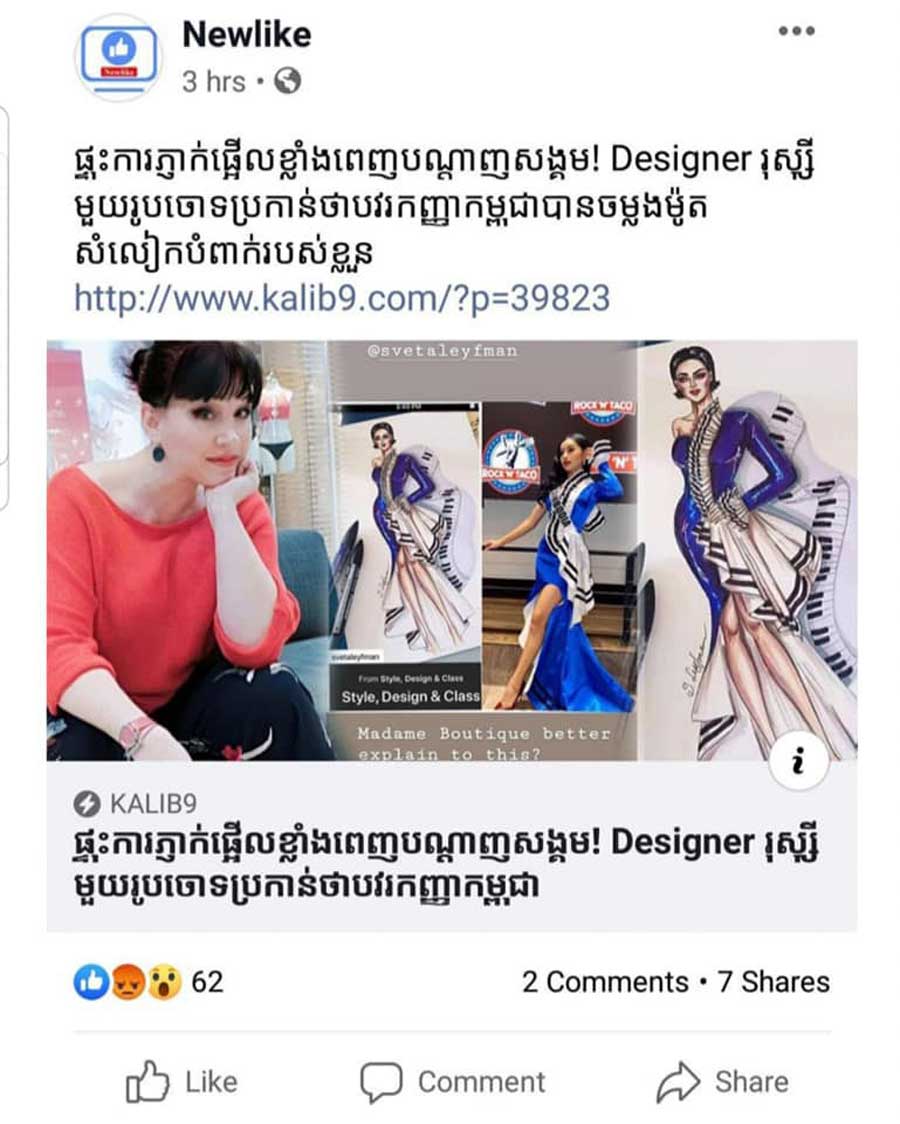 Тогда Светлана опубликовала на собственной странице в «Фейсбуке» фотографию Мисс Камбоджи в этом самом платье — рядом со своей иллюстрацией. И сообщила, что множество ее подписчиков с разных концов света заметили это «совпадение» и сообщили ей. Некоторые из них, рассказала Лейфман, пытались помочь восстановить справедливость — но в итоге были заблокированы на странице дизайнера Мисс Камбоджи.