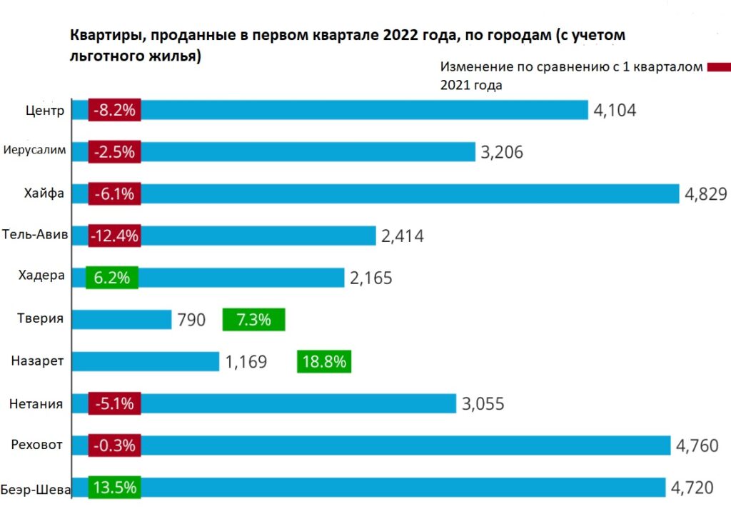 В январе-марте 2022 года продажи квартир в Тель-Авиве снизились на 12%, а в Беэр-Шеве выросли на 14%. На периферии куплена почти половина всего жилья за квартал – 44%, или 13 700 квартир. Это рекорд за последние 22 года.
