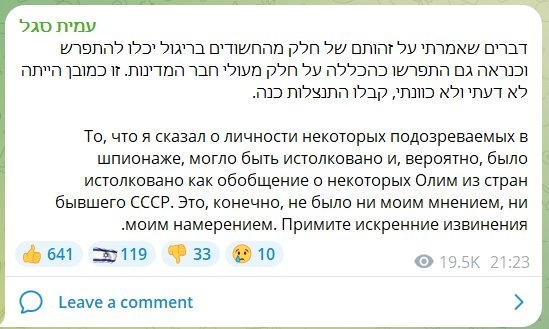 Журналист Амит Сегаль принес извинения за свои высказывания, оскорбительные для репатриантов из стран СНГ. В своем телеграм-канале журналист написал: «Сказанное мною об идентификации части подозреваемых в шпионаже могли истолковать и, вероятно, истолковали как обобщение в адрес части новых репатриантов из СНГ. Это, конечно, не подразумевалось мною и не было моим намерением, примите искренние извинения». Свой текст журналист продублировал на русском языке, что обычно на его странице не практикуется.