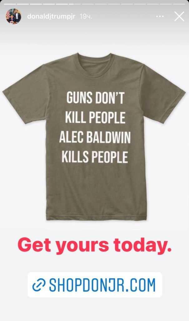 Так, сын бывшего президента США Дональда Трампа, Дональд Трамп-младший, продавал на своем сайте футболки с надписью «Оружие не убивает людей. Алек Болдуин убивает людей». Позже они были бы удалены с сайта.