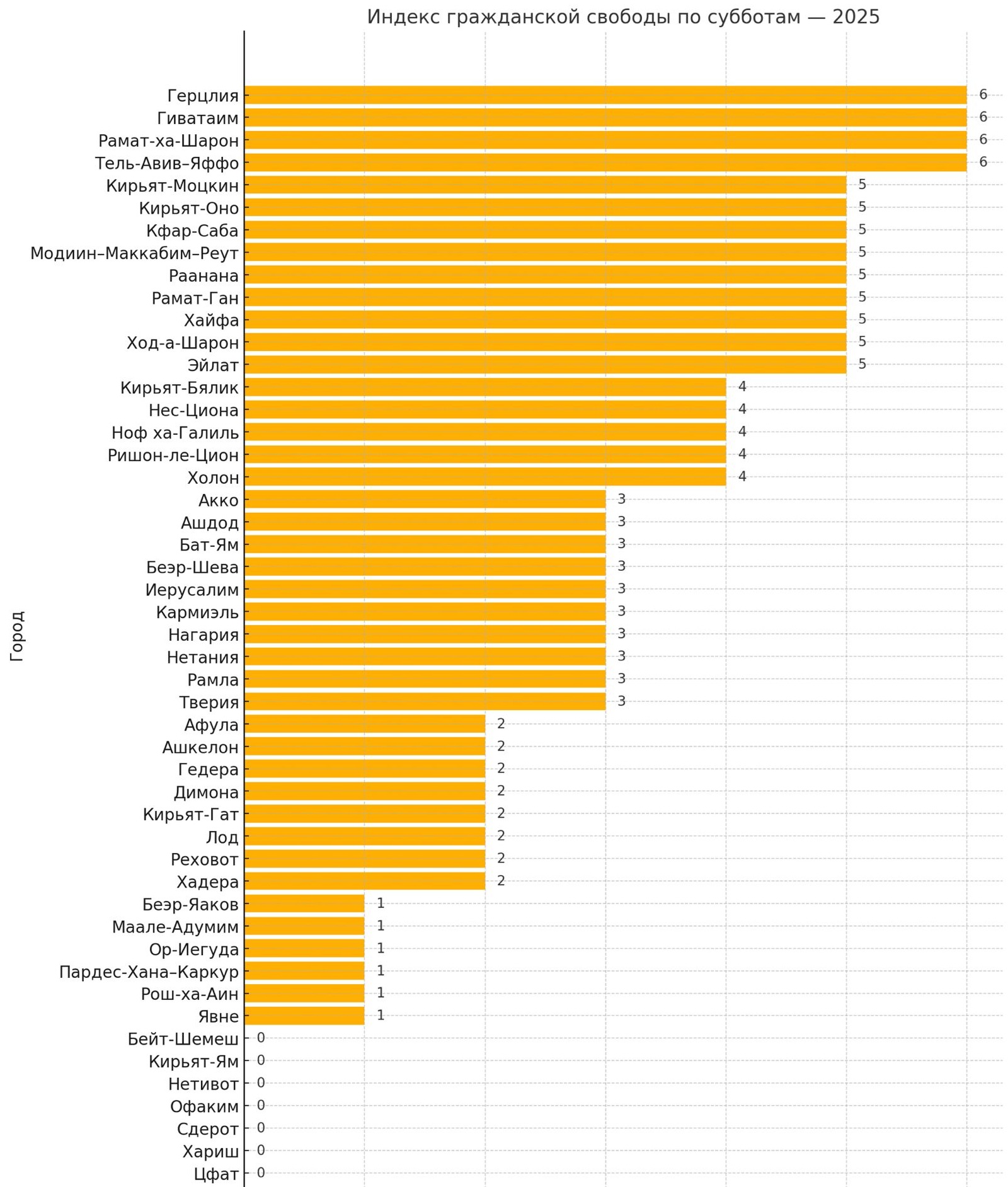 Третий год подряд движение «Свободный Израиль» публикует Индекс гражданской свободы по субботам — рейтинг, который показывает, где в Израиле можно свободно провести выходной, а где в шаббат жизнь практически замирает.