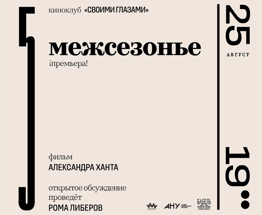 АНУ – музей еврейского народа в партнерстве с книжным магазином «Бабель» и фондом «НАДАВ» представляет пятый вечер киноклуба «Своими глазами». 25 августа зрителей ждет настоящая премьера – первый показ в Израиле и вообще на Ближнем Востоке фильма Александра Ханта «Межсезонье».