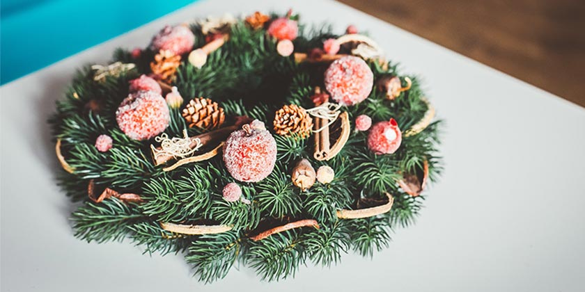 Еловые венки – абсолютный мастхэв новогоднего декора. По традиции они украшают входную дверь с внутренней или с внешней стороны. Если же ваша душа просит более праздничного варианта – добавьте к декору гирлянду, шишки и шарики, а дополнение в виде свечей придадут композиции долю уюта, тепла и мягкости.