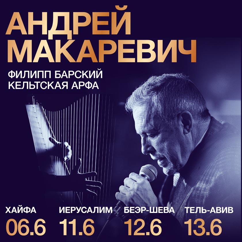 Мини-тур Андрея Макаревича в сопровождении кельтской арфы позволит жителям четырех городов Израиля насладиться этим необычным музыкальным сочетанием. Настоящая кельтская арфа, на которой играет Филипп Барский – удивительный инструмент, придающий особое звучание гитаре и голосу маэстро Макаревича. В программе — новые смыслы, любимые песни и музыка, которая завораживает.