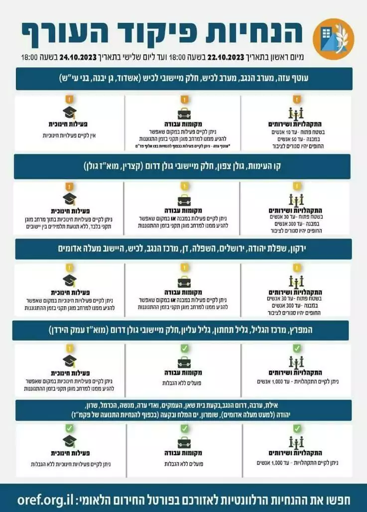 На севере Голанских высот и части поселений на юге Голанских высот можно проводить занятия только в защищенных помещениях. В Центральном Негеве можно проводить занятия только при наличие в школе защищенного помещения.