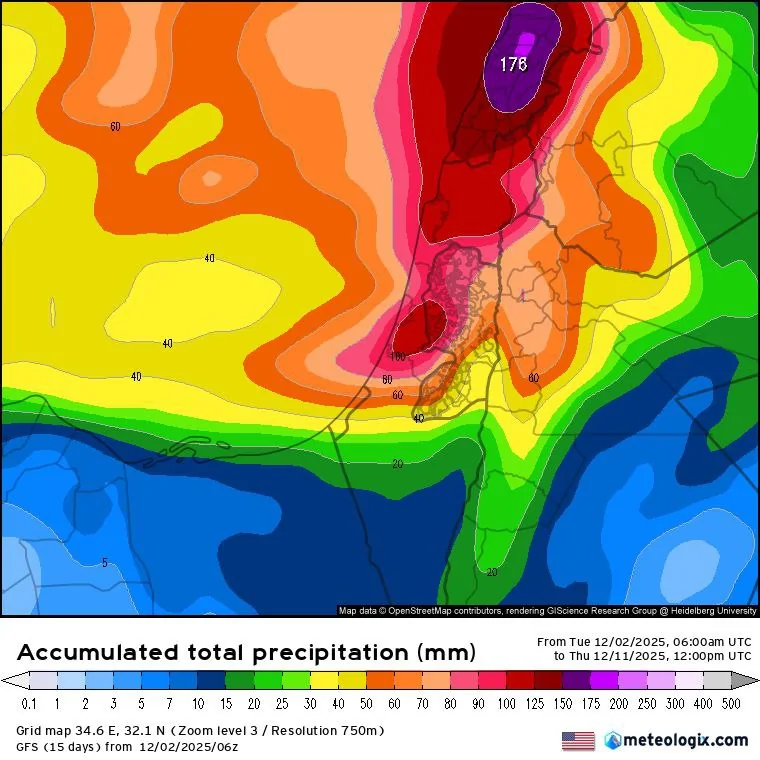 Этот циклон может быть похож на те дожди, которые мы пережили на прошлой неделе: мощные, но краткосрочные. На севере Израиля и в Самарии за 24 часа может выпасть до 80-100 миллиметров дождя. В Эйлате за сутки может выпасть до 40-50 мм дождя, что больше среднегодовой нормы осадков для этого района. Вероятны также наводнения в сухих руслах на юге Израиля.