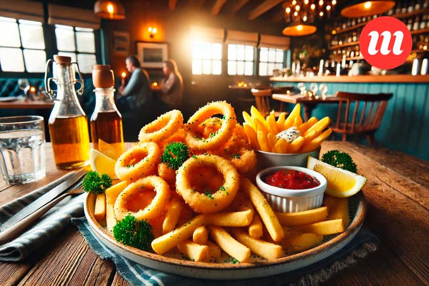 Сытные «Фиш-энд-чипс» с кольцами кальмаров