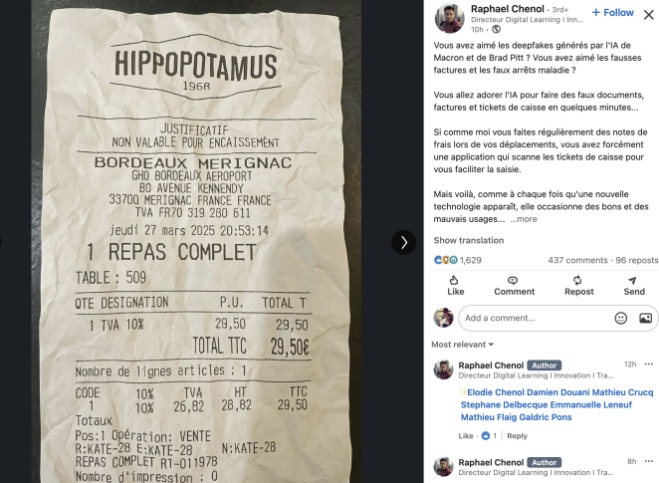 Самый реалистичный пример, найденный TechCrunch, был из Франции, где пользователь LinkedIn опубликовал скомканный чек, сгенерированный искусственным интеллектом для местной сети ресторанов. Он выглядел так натурально, что распознать подделку можно было лишь при внимательном изучении.