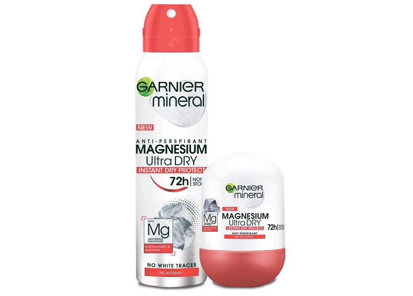 Магнезия, в состав которой входит магний, часто используется спортсменами для обеспечения мгновенной сухости рук. Основным активным ингредиентом для новых дезодорантов также является магний, впитывающий влагу в четыре раза лучше, чем тальк. В новую серию Magnesium Ultra Dry вошли два продукта: шариковый антиперспирант и дезодорант-спрей, которые, благодаря уникальной формуле, делают кожу мягкой и приятной на ощупь, создают эффект дышащей кожи, надежно защищают от появления запаха пота, даря при этом ощущение сухости и свежести на срок до 72 часов.
