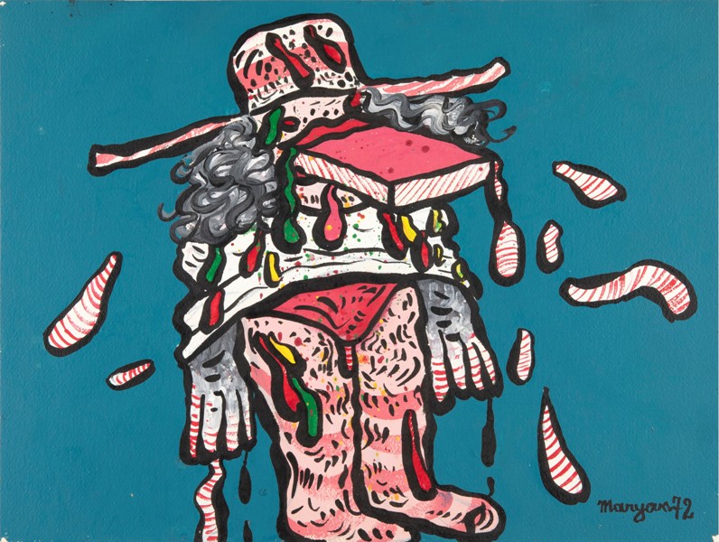 Мир Марьяна – человеческий зверинец. Населенный юродивыми, инвалидами, лагерной охраной, клоунами, инквизиторами, имбецилами – здесь обитают палачи и жертвы, здесь страдают и заставляют страдать. Униженное, растерянное, деформированное человечество, порой разъятое на части: насмешливые зомби с высунутыми языками, почти мультяшные коллажи из ртов, конечностей и летающих органов. Все, что он делал, – это искусство невероятной мощи, оно трагично, хрупко и не поддается классификации.
