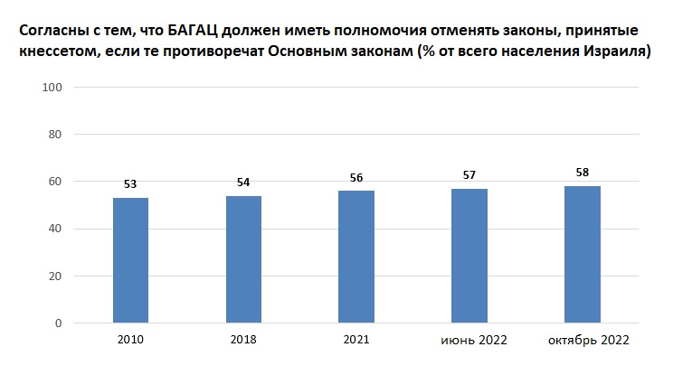 Тем не менее, устойчивое большинство израильтян считает, что у БАГАЦа должно быть право отменять законы, принятые кнессетом, если они противоречат Основным законам государства. (Это право нынешнее правительство хочет отнять в ходе судебной реформы, ссылаясь как раз на «мнение большинства граждан»).