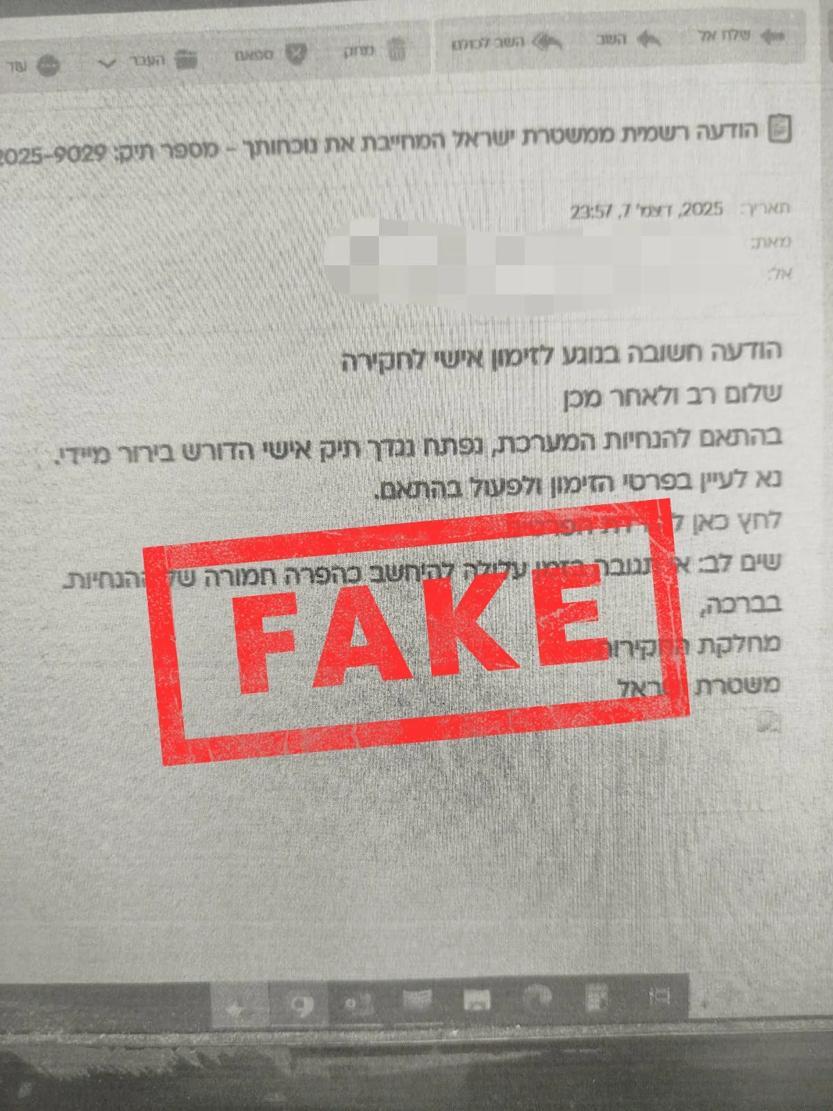 В теме письма на иврите говорится, что это якобы «последнее предупреждение в связи с личной повесткой на допрос».