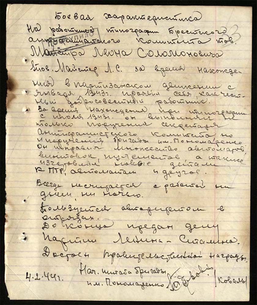 Лейб Соломонович присоединился к группе, которая вскоре стала выпускать листовки не только на немецком, но и на и русском, и на польском языках. Майстер отвечал за ремонт пишущих машинок и подбор шрифтов. Многих букв не хватало, и Майстеру пришлось изготовить их самостоятельно. Ночами он собирал по букве шрифты, вдобавок к машинкам, изготовив наборные кассы и печатный станок. Отпечатанные листовки в соседние Ружаны и более отдаленные Косово и Пружаны доставляли специальные «тройки».