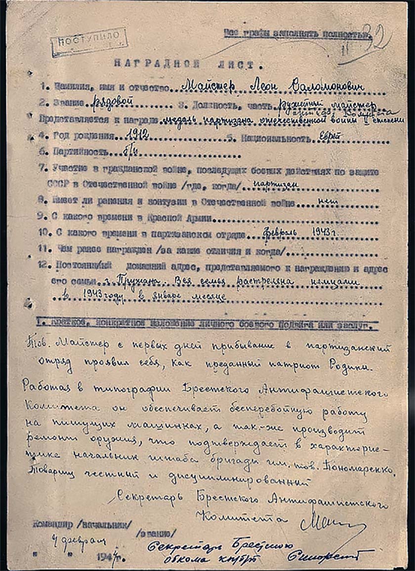В январь 1943 года в гетто оккупированного немцами города Пружаны был арестован механик Лейб Майстер. В гестапо поступили агентурные сообщения о том, что он связан с партизанами. Майстера допрашивали несколько суток, подвергая жестоким пыткам и избиениям, но он продолжал отвергать все обвинения. «Давай его пустим в расход, чего с ним возиться!», – сказал один из следователей, но второй сразу же замахал руками: «А у тебя есть еще один автослесарь!? Это полезный еврей, пускай пока поработает, все равно всем им осталось недолго». В результате Лейб Майстер вышел на волю и продолжил свою борьбу.