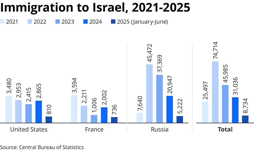 В 2024 году алия из США выросла почти на 20% (2,9 тыс. человек), но в первой половине 2025-го упала на 10% — до 800 человек. Исключение составляют Франция и Великобритания. Из Франции в 2024 году приехало более 2 тыс. репатриантов (вдвое больше, чем годом ранее), а в первой половине 2025-го — еще 750, на треть больше, чем за тот же период прошлого года. Министр алии и интеграции Офир Софер, представитель крайне правой партии «Религиозный сионизм», делает ставку именно на французское направление.