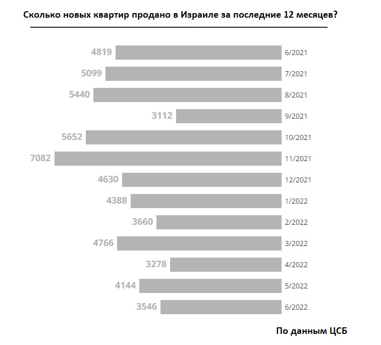 С октября 2021 года количество сдаваемых под ключ новых квартир снижается в среднем на 1,9% в месяц. Но продажи новых квартир падают еще быстрее. За апрель-июнь 2022 года в Израиле было продано 10 970 новых квартир. Это на 14, 4% меньше, чем в январе-марте (12 814).