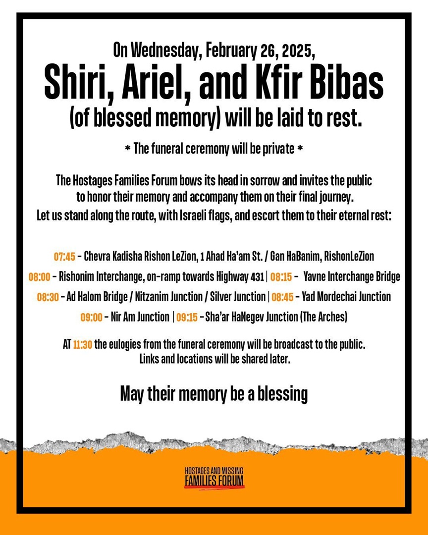 Похороны, Шири, Ариэля и Кфира Бибас, убитых ХАМАСом, пройдут в среду 26 февраля. Сама церемония прощания будет закрытой – там будут присутствовать лишь родные и близкие друзья семьи.