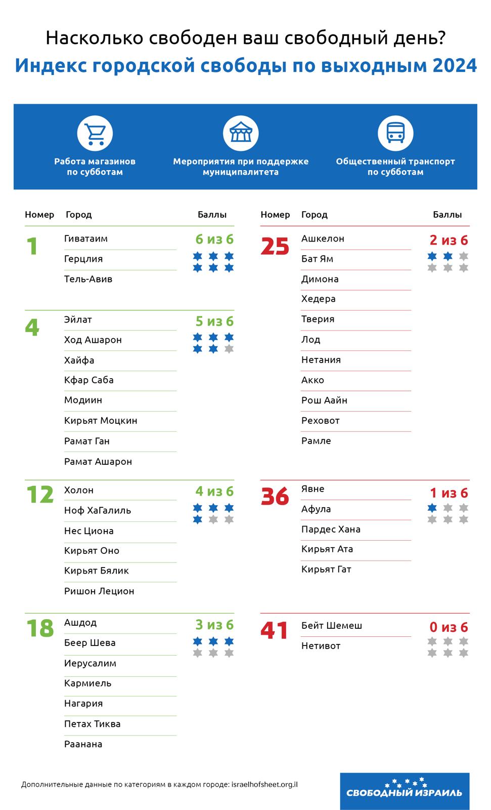 Инфографика: «Свободный Израиль»Первые три места делят Гиватаим, Герцлия и Тель-Авив. В этих городах по субботам можно найти общественный транспорт – хотя и в ограниченном формате, посетить работающие магазины и различные мероприятия, спонсируемые мэрией.