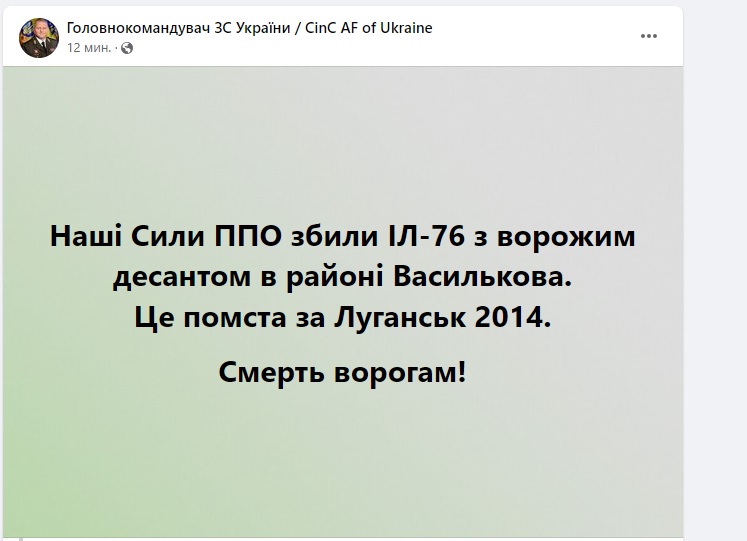 ПВО Украины ночью с 25 на 26 февраля в районе 00: 55 сбили самолет ИЛ-76 с десантом РФ в районе города Васильков, Киевской области. Об этом сообщил в Facebook главнокомандующий Вооруженными силами Украины Валерий Залужный. Количество российских солдат на борту неизвестно. Подтверждений, опровержений или комментариев с российской стороны пока (по состоянию на 01:50 по Тель-Авиву) нет.