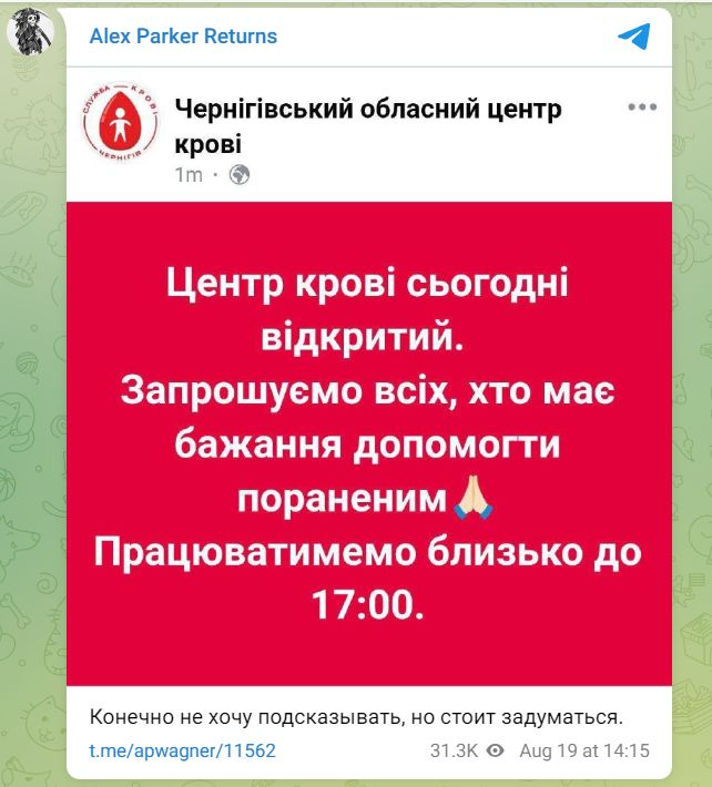 Российские Z-каналы отозвались на удар по Чернигову радостью и ликованием. Телеграм-канал Alex Parker Returns, связанный с ЧВК «Вагнера», предложил следующий удар нанести по Черниговскому областному центру крови, где собирают донорскую кровь для раненых.