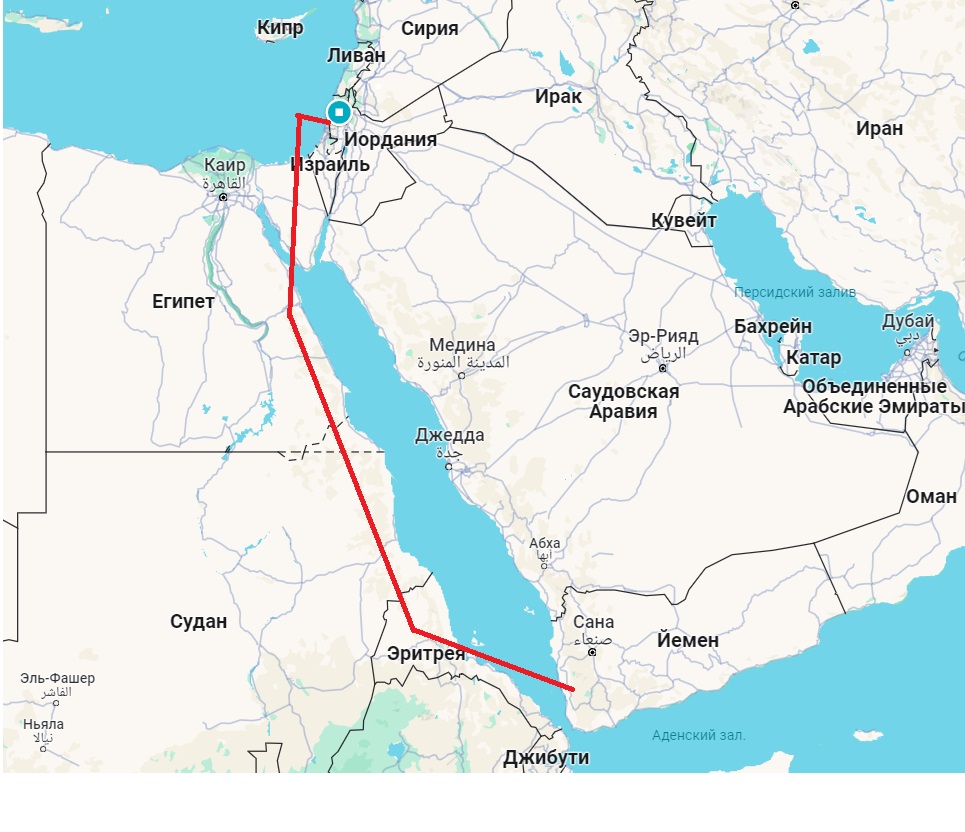 Очень приблизительно маршрут дрона можно представить так, как изображено ниже на карте. Скорее всего, он пролетел над Синайским полуостровом.
