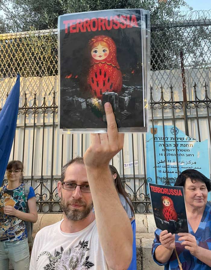 Около 50 активистов движения «Израильские друзья Украины» пикетируют вечером, 14 июня, Сергиево подворье в Иерусалиме, где посольство РФ устроило торжественный прием по случаю Дня России. Участники митинга встречают прибывающих криками «Позор!» и «Слава Украине!» и стараются идентифицировать прибывающих, чтобы выяснить, кто из израильских гостей не погнушался принять приглашение посольства страны, творящей военные преступления в Украине.