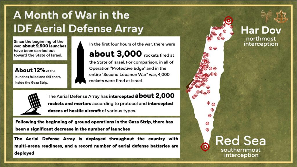 Израильские средства ПВО сбили за время войны 2 тысячи ракет и минометных снарядов, а также десятки дронов разных типов. Система ПВО развернута от горы Дов на севере до Красного моря на юге.