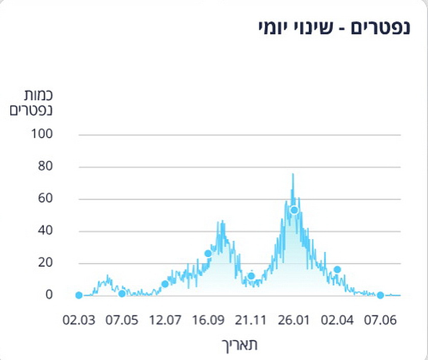 Всего, по данным министерства здравоохранения на четверг, 8 июля, былао выявлено 518 новых инфицированных. Доля положительных реакций на тест четвертый день подряд держится на уровне 0,7 процента. Коэффициент инфицирования R (число людей, которых успевает заразить один человек, подхвативший коронавирус до того, как его изолировали), по данным военной разведки (АМАН) на 8 июля, — 1,4. При R < 1, эпидемия затухает, а при R > 1 – разрастается.