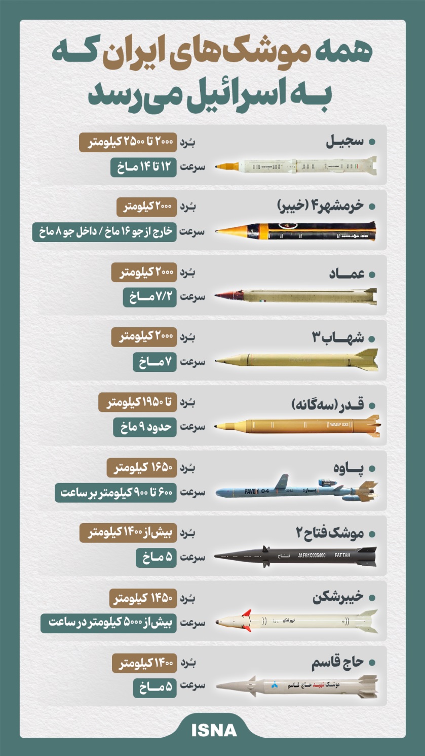 На инфографике, представленной ISNA, изображены девять баллистических ракет: «Саджил», «Хейбар» (четвертое поколение ракет «Хорремшехр»), «Эмад», «Шахаб-3», «Гадр», «Паве», «Фаттах-2», «Хейбар Шекан», «Хадж Касем». Скорость представленных ракет колеблется от 5 до 14 махов (от 6120 до 17 136 километров в час).