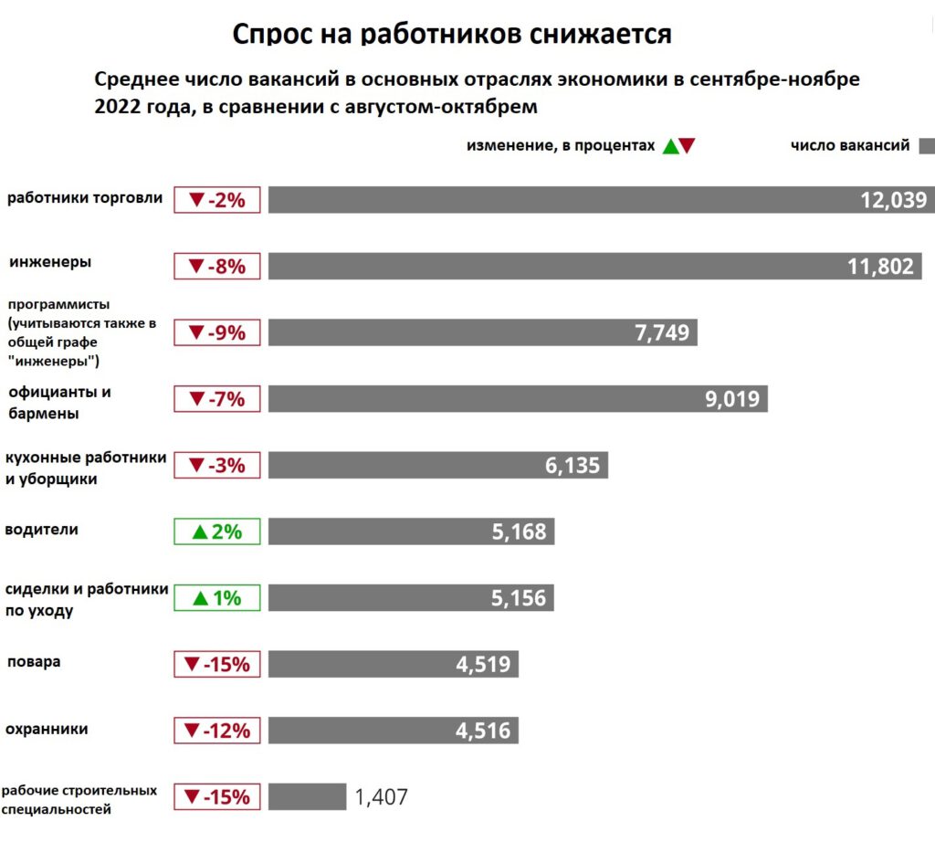 Также резко снизилось число вакансий для поваров и рабочих строительных специальностей. Спрос на эти профессии упал в сентябре-ноябре на 15 процентов.