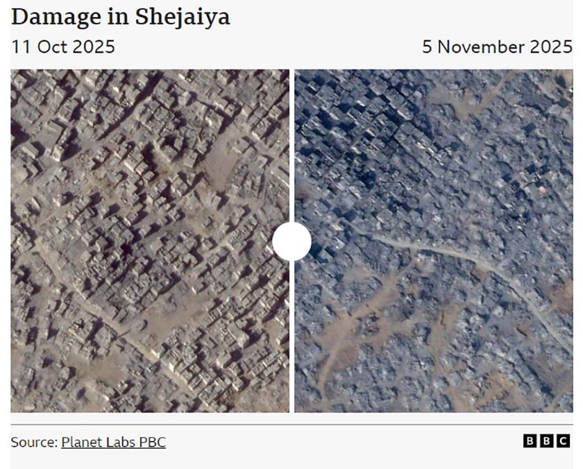 Спутниковые снимки, проанализированные BBC и компанией Planet Labs PBC, показывают масштабные разрушения в кварталах к востоку от Рафиаха и Хан-Юниса, а также в районе Шуджайя в Газе. В некоторых местах целые жилые массивы, которые до перемирия оставались относительно неповреждёнными, впоследствии были стёрты с лица земли.