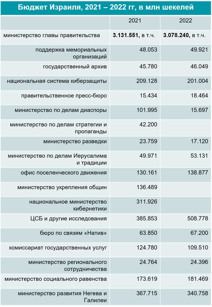 В отдельном документе описаны функции множества регулирующих органов, на которые в 2021-2022 годы будет потрачено около 4 млрд шекелей — в их числе Управление защиты прав потребителей, Управление природного газа, Управление энергетики, Управление заповедников и парков и другие.